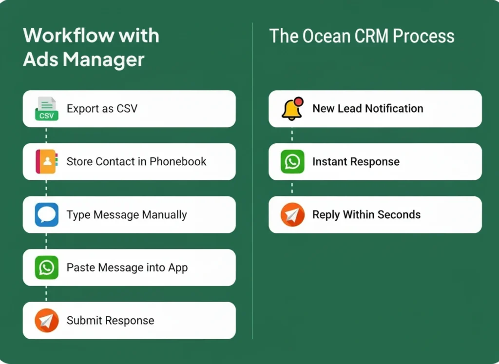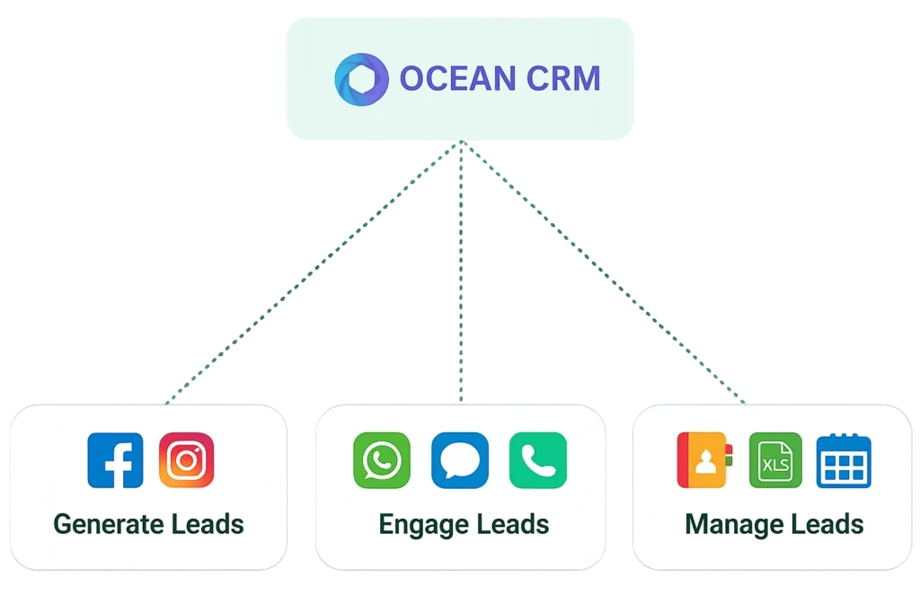 Ocean CRM connects directly to your Facebook Ads, Website Forms, and WhatsApp, automatically pulling every lead into your dashboard in real time. No matter your industry — real estate, education, healthcare, retail, finance, or services — your team can respond instantly while your competitors are still checking their inbox.