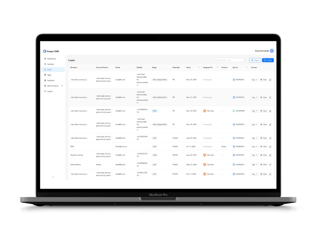 Ocean CRM automatically routes each new Facebook or website lead to the right team member — sales, support, or marketing — ensuring faster responses and zero missed follow-ups.