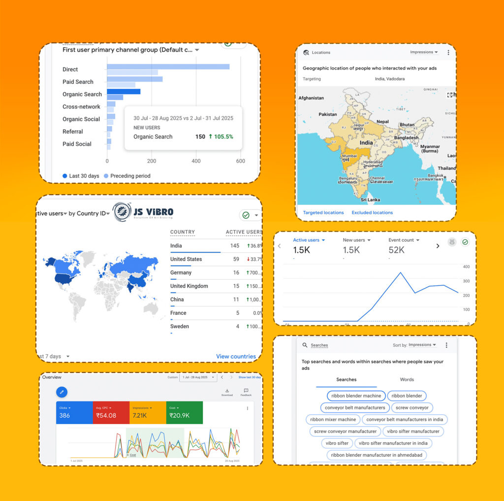 We made sure that when someone searched for “vibro sifter” or “ribbon blender” on Google, JS Vibro showed up. Through Technical SEO and ad campaigns, we brought in the right traffic of the people who were actually looking to buy and not just digital tourists scrolling around like it’s a Sunday bazaar. As a result, we got more leads, more calls, and more serious buyers.