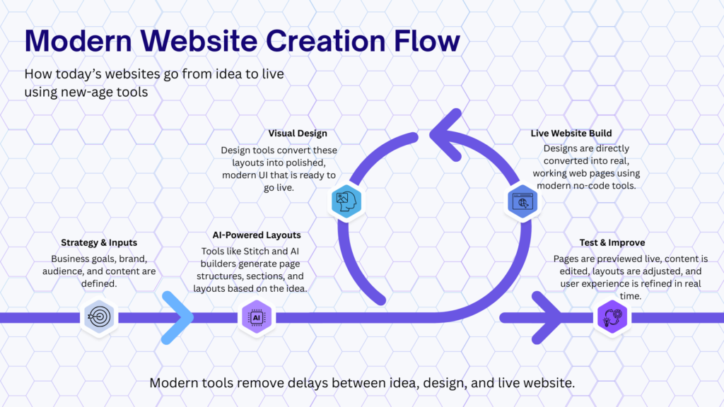 Modern platforms now combine design, content, AI, building, and publishing into one seamless workflow — allowing businesses to go from idea to live website faster than ever before.